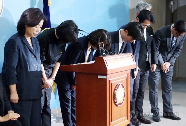정의당 이정미 대표와 당직자들이 30일 오전 국회 정론관에서 정의당 고 노회찬 원내대표의 죽음에 애도의 뜻을 보내주신 국민께 고개 숙여 감사인사를 하고 있다.
