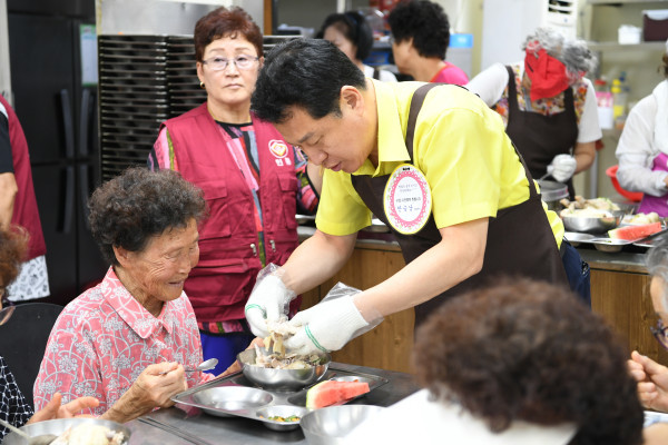 안승남 경기 구리시장은 30일 인창경로식당에서 민족통일 구리시협의회 회원 24여명과 함께 지역내 노인들에게 삼계탕 225그릇과 수박을 대접하는 급식봉사활동을 진행했다. 사진은 안 시장이 지역노인에게 삼계탕을 대접하고 있는 모습. (사진제공=구리시청)