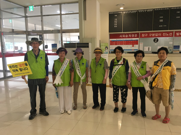 경기 동두천시 보건소는 최근 동두천터미널에서 대한노인회 동두천시지회와 함께 건강증진 캠페인을 실시했다. 이번 캠페인은 대한노인회 동두천시지회에서 추진하는 ‘어르신 재능 나눔 활동’과 연계해 실시했다. 사진은 캠페인 참여자들이 기념촬영을 하고 있는 모습. (사진제공=동두천시청)