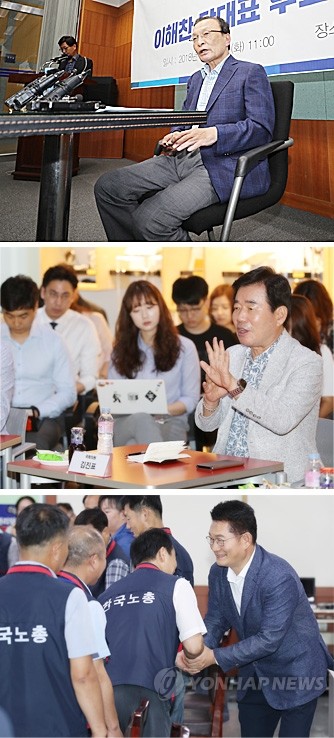 더불어민주당 차기 당권 주자로 나선 이해찬 의원이 31일 오전 전북 전주시 완산구 전북도의회에서 기자회견을 열고 취재진 질문에 답변하고 있다(위부터). 김진표 의원은 이날 서울 SK오픈콜라보 센터를 방문, 경제정책 간담회에서 발언하고 있다. 송영길 의원도 이날 서울시청 노동조합 회의실을 방문, 지부장 정기회의에서 참석자들과 인사하고 있다.