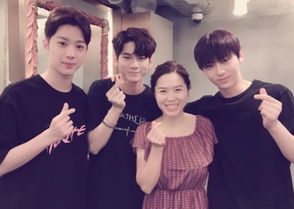 사진 속 김지선은 워너원 라이관린, 옹성우, 황민현 옆에서 손하트를 그리며 밝게 웃고 있다. 특히 워너원 멤버들은 검은색 티셔츠를 입고 훈훈한 비주얼을 뽐내 눈길을 끈다.