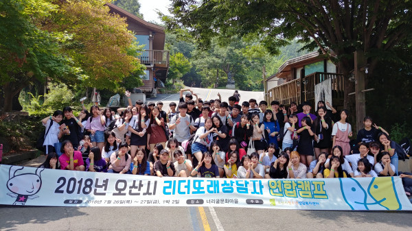 경기 오산시 청소년상담복지센터는 지난 7월26~27일 1박2일간 안성시 너리굴문화마을에서 ‘2018년 오산시 리더또래상담자 연합캠프’를 진행했다. 사진은 연합캠프에 참석한 또래상담자 청소년들이 캠프 종료 후 기념촬영을 하는 모습. (사진제공=오산시청)