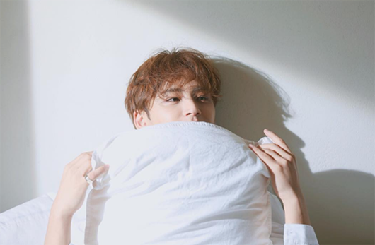 사진에서는 청량함이 돋보인다. 민규는 흰색을 배경으로 앉아 있다. 베개를 들고 수줍은 듯 얼굴을 가렸다. 벽에 비친 그림자로 분위기를 더했다.