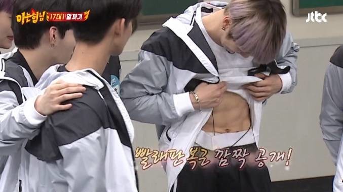 이에 이수근은 "알까기 말고 배까기 어때"라며 통통한 배를 내밀었다. 그러자 워너원 박우진은 자신의 볼록한 배를 자랑해 보는 이들을 놀라게 했다.