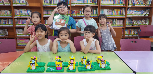 경기 수원시 팔달구 지동 새마을문고는 최근 여름방학을 맞은 어린이를 대상으로 한 ‘클레이로 상상하는 그림책’ 프로그램을 개강했다. 사진은 프로그램에 참여한 어린이들이 기념촬영을 하는 모습. (사진제공=팔달구청)