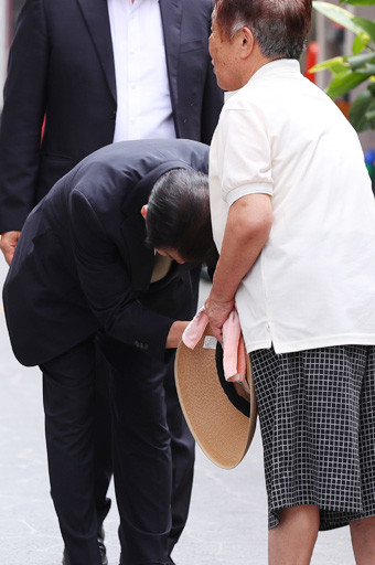 정동영 민주평화당 대표가 7일 오후 서울 종로구 서촌 본가궁중족발 앞에서 열린 ‘백년가게 특별법’ 제정 촉구 기자회견 참석을 위해 이동하던 중 인근 주민들에게 90도로 인사를 하고 있다.