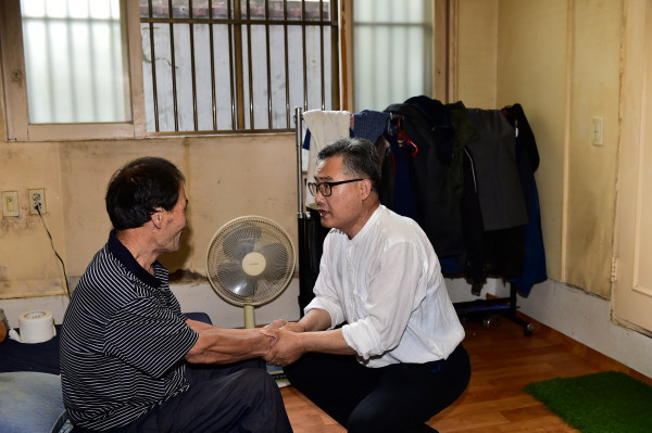 | ▲ 무더위쉼터를 이용 중인 한 노인과 이야기를 나누고 있는 오진환 부의장(오른쪽)의 모습. (사진제공=양천구의회) | ||