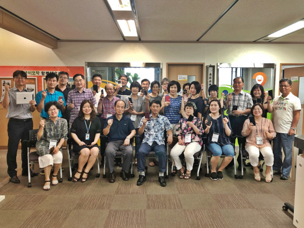 경기 부천시 인생이모작지원센터는 7일 홍보·마케팅과 창업 스마트폰 아카데미를 개강했다. 이번 아카데미는 5060 베이비부머 20명을 대상으로 총 8회에 걸쳐 창업을 위한 전문 스마트폰 강의로 진행된다. 사진은 참여자들이 기념촬영을 하고 있는 모습. (사진제공=부천시청)