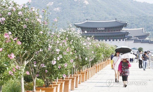 나라꽃 무궁화 전국축제를 앞두고 8일 오전 서울 광화문 광장에 전국에서 출품된 1200여점의 무궁화 분화들이 전시돼 있다.