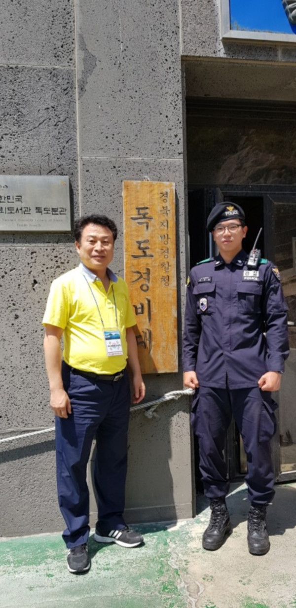 안승남 경기 구리시장은 지난 6~8일 사흘간 시청 공무원을 비롯해 박영희 울릉도 명예대사 등 민·관 대표단과 함께 자매도시인 경북 울릉군을 첫 방문했다. 사진은 울릉군 방문의 일환으로 독도를 방문한 안 시장이 독도경비대원과 기념촬영을 하는 모습. (사진제공=구리시청)