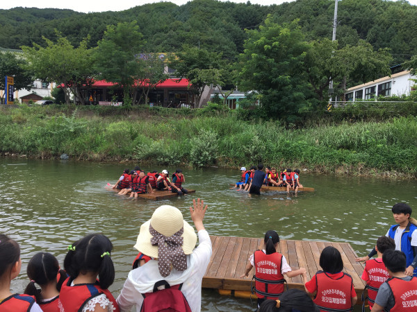 인천 계양구 드림스타트는 여름방학을 맞이한 드림아동들을 위해 지난 7일 경기 양평군에서 ‘외갓집 체험 프로그램’을 운영했다. 사진은 프로그램에 참여한 어린이들이 '뗏목타기 체험'을 하고 있는 모습. (사진제공=계양구청)