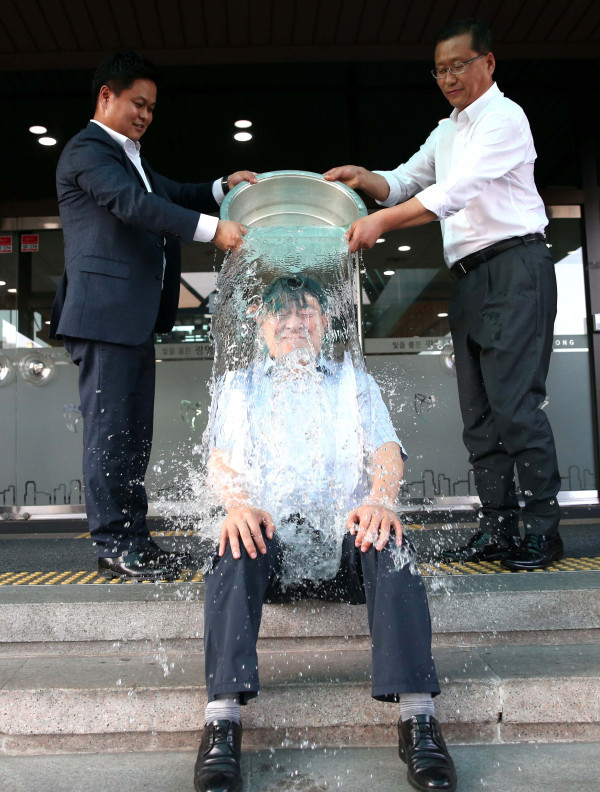 박승원 경기 광명시장은 최근 시청본관 앞에서 루게릭병 환자의 고통을 나누는 아이스버킷 챌린지에 동참했다. 이날 아이스버킷 챌린지는 조미수 광명시의회 의장이 박 시장을 지목해 진행됐다. 사진은 박 시장이 얼음물을 뒤집어쓰는 모습. (사진제공=광명시청)