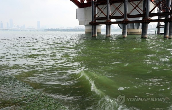 9일 서울 성산대교 북단 지역의 녹조로 초록색으로 변한 한강물이 출렁이고 있다. 서울시는 지난 6일 실시한 한강 서울 구간 조류측정 결과 잠실수중보 하류구간인 성산대교 지점 친수구역에서 올해 처음으로 조류경보 기준치를 초과했다고 9일 밝혔다.