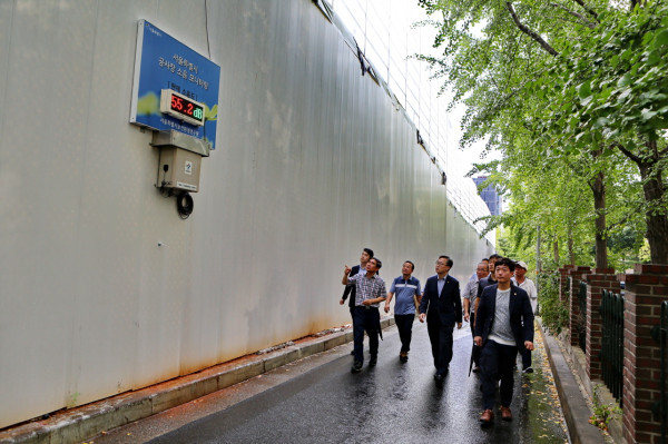 평소 현장행정을 강조해 온 유성훈 금천구청장이 9일 소음문제로 민원이 계속되고 있는 공사현장을 직접 살펴보고, 지역주민과 함께 해결방안 찾기에 나섰다. 사진은 유 구청장이 가산동 두산위브아파트 인근 공사장 외벽에 설치된 소음측정기의 수치를 확인하고 있는 모습.(사진제공=금천구청)