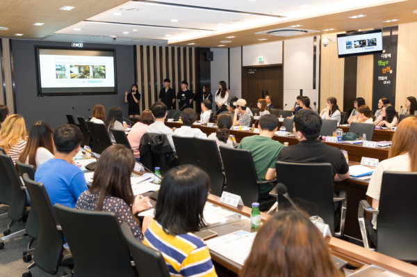 서울 양천구가 최근 ‘여름방학 대학생 아르바이트 근무종료 간담회’를 열고 지역디자인사업 결과발표 등을 실시했다. 이날 결과발표에서는 ▲청년 기본조례 제정·청년 거버넌스 구축 ▲4060세대를 모두 아우를 수 있는 문화생활 프로그램 운영 등 다양한 아이디어가 제시됐다. 사진은 발표 진행 모습.(사진제공=양천구청)