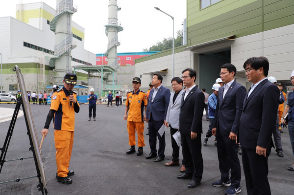 경기 포천소방서는 지난 8일 발생한 GS포천그린에너지 폭발사고와 관련해 최근 브리핑을 진행했다. 사진은 소방서 재난예방과장이 김영우 국회의원 등 관계자들에게 합동감식 결과 등을 브리핑하는 모습.(사진제공=포천소방서)
