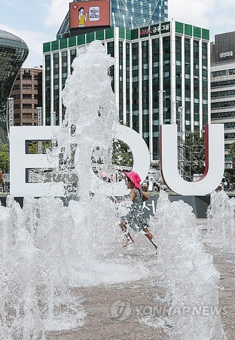 폭염의 기세가 누그러지지 않은 12일 오후 서울시청 앞 분수대를 찾은 어린이들이 뜨거운 하늘 아래 물놀이를 하며 더위를 식히고 있다.