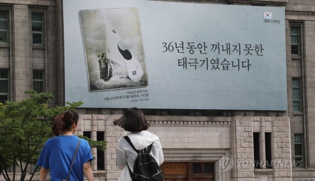 13일 서울광장 꿈새김판에 광복절 기념 현수막이 걸려 있다. '36년 동안 꺼내지 못한 태극기였습니다.'라는 문구가 광복 직후 남산에서 시민들이 대형 태극기를 게양하는 사진과 걸려 있다.