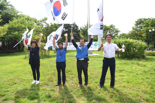 경기 하남시는 14일 제73주년 광복절을 맞아 전가정의 태극기 달기 운동 동참을 유도하고자 바르게살기운동 하남시협의회 주관으로 ‘나라사랑 태극기 달기 운동’ 가두 캠페인을 전개했다. 사진은 김상호 시장 등 캠페인 참가자들이 태극기를 흔들고 있는 모습. (사진제공=하남시청)