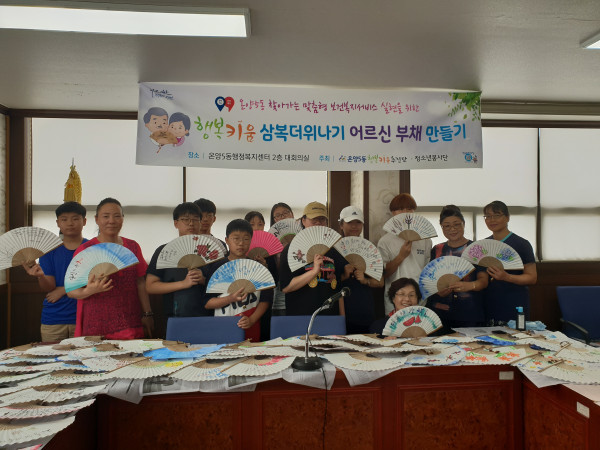 충남 아산시 온양5동 행복키움추진단이 최근 온양5동 청소년봉사단과 연계해 청사 2층 대회의실에서 '행복키움 삼복더위나기 어르신 부채 만들기' 2차 행사를 가졌다. 사진은 참여자들이 직접 만든 부채를 들고 기념촬영을 하는 모습. (사진제공=아산시청)