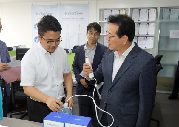 정순균 강남구청장은 최근 역삼동에 위치한 대한민국 대표 기술창업 인큐베이터 팁스타운(Tech Incubator Program for Startup Town)을 방문, 현장을 시찰하고 입주기업을 격려했다. 사진은 정 구청장(오른쪽)이 팁스 프로그램 참여 기업의 제품에 대해 설명을 듣고 질문을 하고 있는 모습. (사진제공=강남구청)