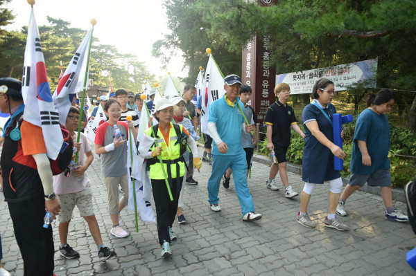 경기 남양주시는 15일 ‘광복 제73주년 기념행사’의 일환으로 금곡동 홍유릉 광장에서 ‘평화통일기원 시민걷기대회’를 개최했다. 사진은 시민걷기대회에 참석한 지역주민이 태극기를 들고 행진하고 있는 모습. (사진제공=남양주시청)