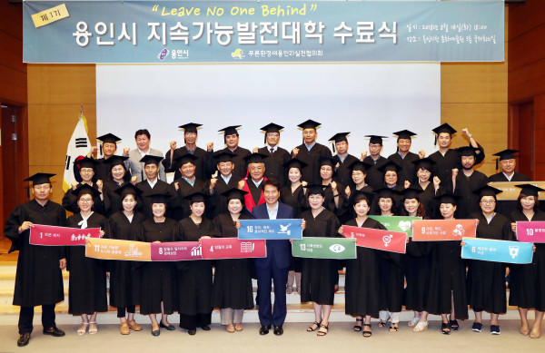 경기 용인시에 위치한 환경단체인 푸른환경새용인21실천협의회는 지난 5월29일부터 운영해온 ‘제1회 지속가능발전대학’의 수료식을 지난 14일 시 문화예술원 국제회의실에서 개최했다. 사진은 백군기 시장 등의 관계자들이 기념촬영을 하는 모습. (사진제공=용인시청)
