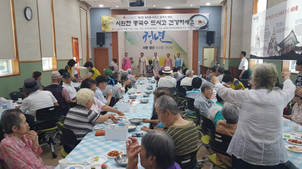 경기 오산시 세마동 지역사회보장협의체는 지난 13일 세마동 지역내 노인들을 대상으로 시원한 콩국수를 대접하는 행사를 진행했다. 사진은 콩국수 대접 행사에 참석한 노인들이 식사를 하고 있는 모습. (사진제공=오산시청)