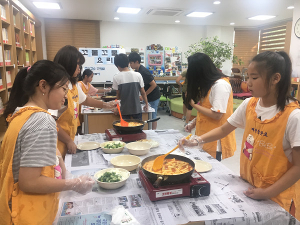 경기 수원시 팔달구 매산동 새마을문고회에서는 지난 14일 여름방학을 맞아 지역내 어린이 20명을 대상으로 요리교실 여름방학 특강을 진행했다. 사진은 학생들이 떡볶이를 만들고 있는 모습. (사진제공=팔달구청)