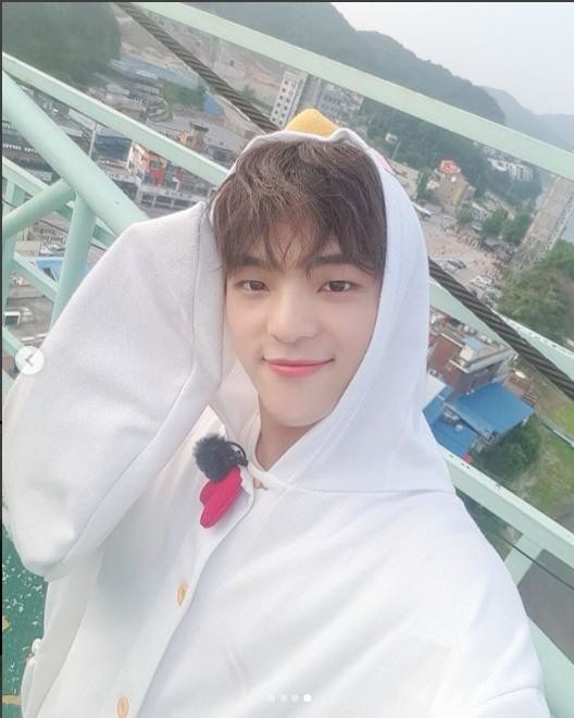 공개된 사진 속 우진은 캐릭터 의상을 입고 번지점프대 위에 올라 신난 모습. 우진은 번지 점프를 앞두고 높은 곳에 올라서도 두려움 없이 활짝 웃어보여 시선을 끌었다.
