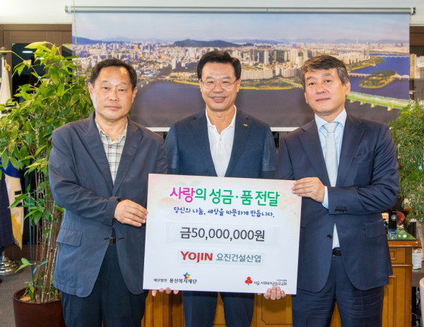 서울 용산복지재단이 요진건설산업으로부터 사랑의 성금 5000만원을 기탁받았다. 사진은 김유태 용산복지재단 사무국장(왼쪽부터), 성장현 구청장, 최은상 요진건설산업 대표이사가 기념촬영을 하는 모습. (사진제공=용산구청)