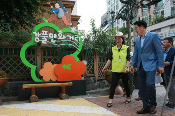 | ▲ 강풀만화거리를 방문한 이정훈 구청장(오른쪽)이 강풀만화거리 해설사로부터 설명을 듣고 있다.(사진제공=강동구청) | ||