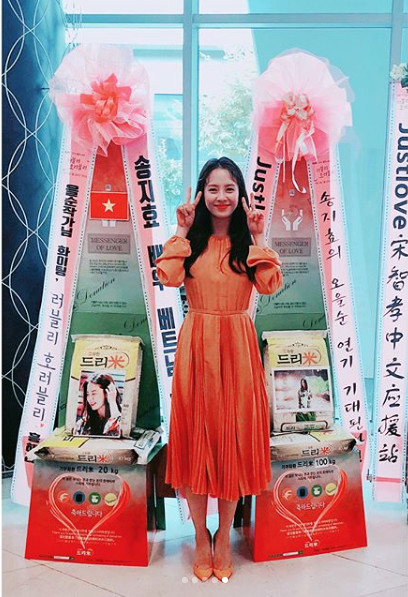 송지효는 자신의 SNS에 "여러분 감사감사감사합니다..."라는 글과 함께 사진을 게재했다. 공개된 사진 속 송지효는 드레스를 입고 깜찍하게 브이를 그리며 미소를 짓고 있는 모습이 담겼다.