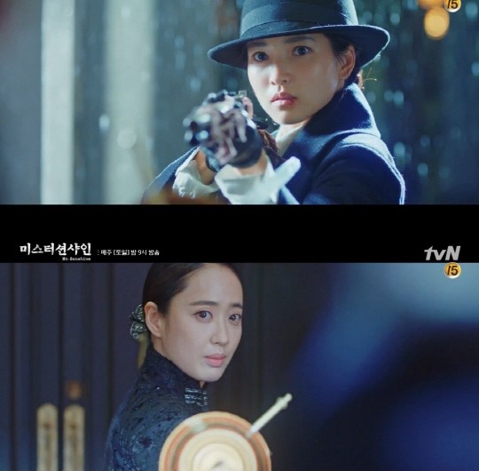 지난주 방송된 '미스터 션샤인'에서 애신(김태리 분)은 이완익(김의성 분)의 집에 잠입했다. 그러나 그곳에는 쿠도 히나(김민정 분)도 함께 있었다. 인기척을 느낀 두 사람은 총과 칼로 맞붙었고, 서로의 복면과 가면을 벗겨냈다.