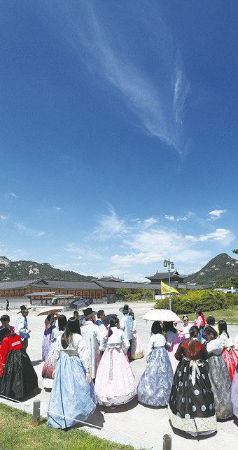 맑은 가을 하늘을 보인 18일 경복궁에서 관광객들이 한복을 입고 관람하고 있다. 주말 동안 주춤했던 폭염이 월요일인 20일부터 다시 당분간 이어질 전망이다. 이날 낮 최고기온은 27∼34도로 예보됐다. 기상청은 “월요일부터 폭염특보가 다시 확대된다”면서 “무더위가 장기간 지속하므로, 온열 질환자 발생 및 농·축·수산물 피해에 대비해야 한다”고 당부했다.
