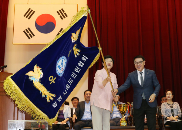| ▲ 19일 조미수 광명시의회 의장(사진 왼쪽)이 제4회 광명시의회 의장기 배드민턴 대회 개회식에 참석해 지난해 우승팀의 기를 받아 흔들고 있다. (사진제공=광명시의회) | ||