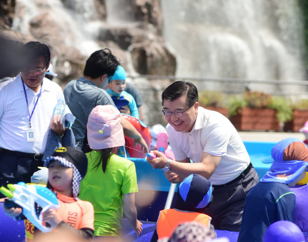 류경기 중랑구청장이 19일 용마폭포공원(중랑구 면목동)에 설치된 ‘찾아가는 이동식 물놀이장’을 방문해 물놀이를 즐기고 있는 어린이들과 신나게 물총싸움을 하고 있다. (사진제공=중랑구청)