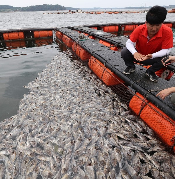 천수만인 충남 서산시 부석면 창리 가두리 양식장에서 우럭이 무더기로 폐사했다. 지난 주말부터 어른 손바닥 만한 크기에 200∼300g 무게의 우럭들이 죽은 채 떠오르기 시작하면서 20일 오후 현재까지 90여만마리가 피해를 본 것으로 추산된다.