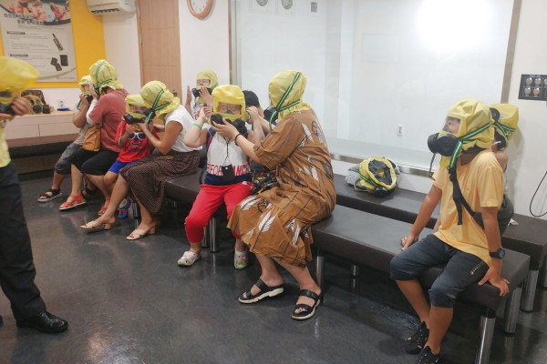 경기 부천시 드림스타트는 최근 365안전교육장에서 아동 안전교육 프로그램 ‘우리의 안전은 스스로 지켜요’를 진행했다. 사진은 안전교육에 참여한 어린이와 부모들이 방독면 착용 및 가스 체험을 하고 있는 모습. 사진제공=부천시청)