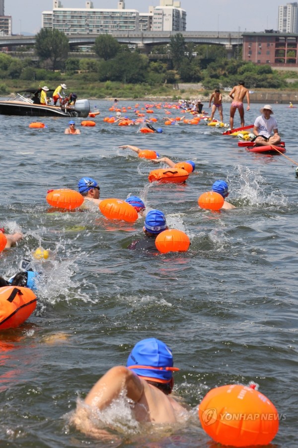 휴일인 19일 서울 잠실한강공원에서 열린 2018한강 크로스스위밍챌린지에 참가한 사람들이 한강물에 몸을 담그고 힘차게 수영하고 있다.