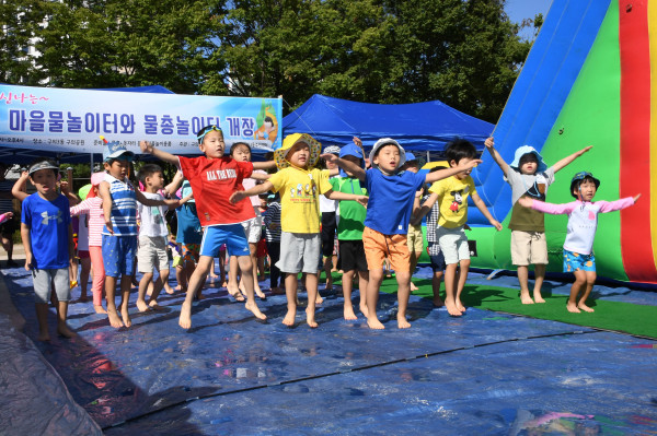 서울 광진구 구의3동 주민들이 마을총회를 통해 선정한 의제 중 첫 번째 실천사업인 ‘물놀이터’가 지난 17일 오전 10시~오후 4시 6시간 동안 구의공원에서 개장했다. 사진은 ‘물놀이터’에 참여한 어린이들이 물놀이를 하기 전에 준비운동을 하고 있는 모습. (사진제공=광진구청)
