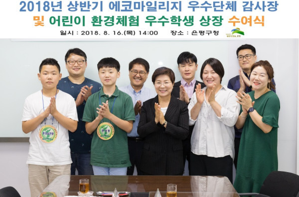 최근 서울 은평구가 서울시 25개 자치구내 에코마일리지 단체를 대상으로 실시한 2018년 상반기 에코마일리지 자치구 단체활동 평가에서 ‘온실가스 배출량 10% 이상 감축’으로 선정된 2개 단체에 감사장을 수여했다. 사진은 김미경 구청장(가운데)이 감사장을 수여한 후 기념촬영을 하는 모습. (사진제공=은평구청)