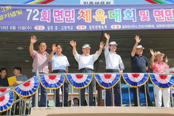 최근 경기 안성시 일죽면은 일죽 중·고등학교 교정에서 우석제 시장과 김학용 국회의원, 신원주 시의장을 비롯한 지역주민들이 참석한 가운데 ‘제73주년 광복절 기념 일죽면민 체육대회’를 성료했다. 사진은 체육대회에 참석한 관계자들이 인사하는 모습. (사진제공=안성시청)