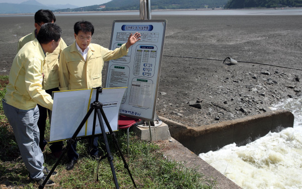 강풍과 집중호우를 동반한 제19호 태풍 ‘솔릭’의 남해안 상륙이 예상됨에 따라 시설물과 농작물피해예방이 절실한 가운데 21일 전남 강진군 강진읍의 임천배수장을 찾은 이승옥 강진군수가 배수장 수혜지역인 257ha 벼논 침수예방에 최선을 다해달라고 당부하고 있다. (사진제공=강진군청)