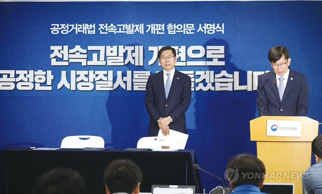 김상조 공정거래위원장과 박상기 법무부 장관(왼쪽)이 21일 오전 서울 세종로 정부서울청사에서 ‘공정거래법 전속고발제 개편 합의문’에 서명을 마친 후 설명하고 있다.