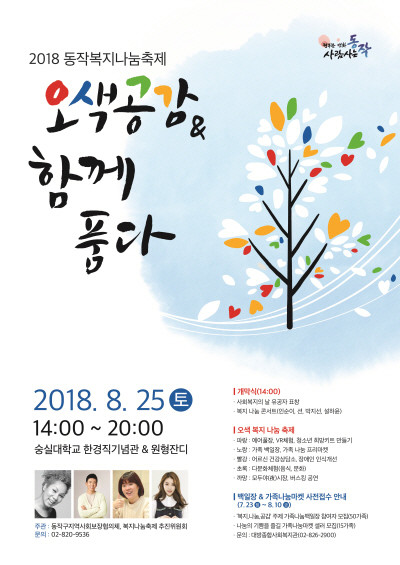 서울 동작구(구청장 이창우)는 오는 25일 오후 2~8시 숭실대학교에서 2018 동작복지나눔축제 ‘오색공감&함께품다’를 개최한다.