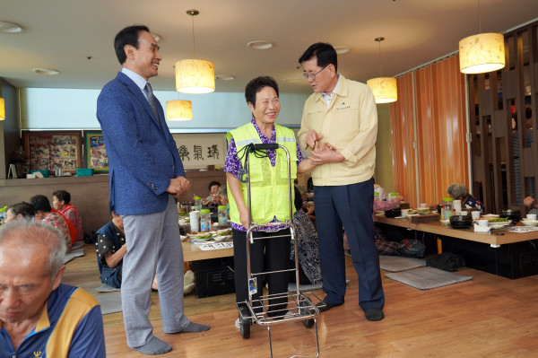 21일 서울 동대문구지역사회보장협의체가 지역내 한 음식점에서 폐지수집 노인 100명에게 식사를 대접하고 안전용품을 지급했다. 사진은 행사에 참석한 유덕열 구청장이 안전조끼를 입은 노인에게 안전하게 폐지를 수집할 것을 당부하고 있는 모습. (사진제공=동대문구청)