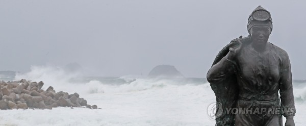 | ▲ 제주도가 제19호 태풍 ‘솔릭’의 영향권에 든 22일 오전 서귀포시 법환포구에 설치된 해녀상 뒤로 거센 파도가 몰아치고 있다.(사진제공=연합뉴스) | ||