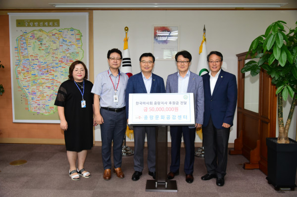 한국마사회 중랑문화공감센터가 22일 서울 중랑구에 지역 복지단체 및 지역 현안사업 지원을 위해 5000만원을 기탁했다. 사진은 류경기 구청장(가운데) 및 관계자들이 기념촬영을 하는 모습. (사진제공=중랑구청)