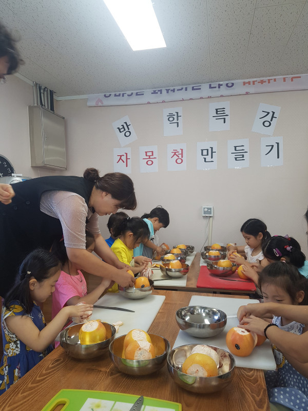 경기 수원시 팔달구 우만2동에서는 22일 새마을문고 주관으로 우만2동 시립어린이집 어린이들과 '방학특강 자몽청 만들기 체험' 행사를 진행했다. 사진은 어린이들이 자몽청을 만들고 있는 모습. (사진제공=팔달구청)